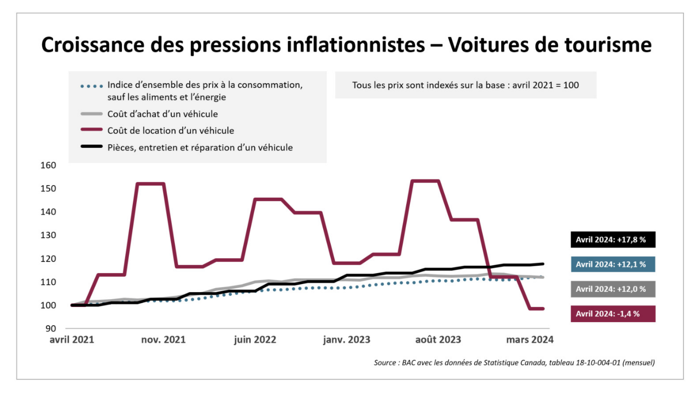 Au plus fort de la crise inflationniste au Canada, l’indice des prix à la consommation (une mesure de la variation moyenne dans le temps des prix payés par les consommateurs pour les produits de consommation et les services) a atteint 8,1 % en juin 2022. Toutefois, selon les données de Statistique Canada, les assureurs ont constaté que les coûts des sinistres automobiles étaient beaucoup plus élevés que le taux d’inflation maximal. Par exemple, ces trois dernières années, les prix des véhicules de tourisme neufs ont augmenté de 12,1 %, tandis que les prix des pièces de rechange et des véhicules de remplacement ont augmenté de 18 %.